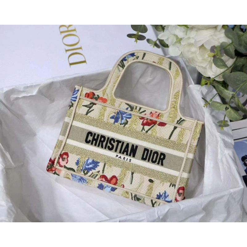 ‘Christia Christian Dior Mini Book Tote Beige Multicolor Hibiscus Metallic Thread Embroidery
